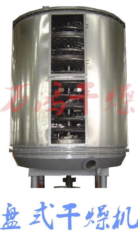 濕物料自加料器連續(xù)地加到干燥器上部層干燥盤上,帶有耙葉的耙臂作回動使耙臂作回動使耙葉連續(xù)地翻抄物料。物料沿指數(shù)螺旋線流過干燥盤表面,在小干燥盤上的物料被移送到外緣,并在外緣落到下方的大干燥盤外緣,在大干盤上物料向里移動并從中間落料口落如下一層小干燥盤中。大小干燥盤上下交替排列,物料得以連續(xù)地流過整個干燥器。中空的干燥盤內(nèi)通入加熱介質(zhì),加熱介質(zhì)形式有飽和蒸汽、熱水和導(dǎo)熱油,加熱介質(zhì)由干燥盤的一端進(jìn)入,從另一端導(dǎo)出。已干物料從^后一層干燥盤落到殼體的底層,^后被耙葉移送到出料口排出。濕份從物料中逸出,由設(shè)在頂蓋上的排濕口排出,真空型盤式干燥器的濕氣由設(shè)在頂蓋上的真空泵口排出。從底層排出的干物料可直接包裝。通過配加翅片加熱器、溶劑回收冷凝器、袋式除塵器、干料返混機(jī)構(gòu)、引風(fēng)機(jī)等輔機(jī),可提高其干燥的生產(chǎn)能力,干燥膏糊狀和熱敏性物 料,可方便地回收溶劑,并能進(jìn)行熱解和反應(yīng)操作。
