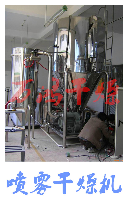 空氣經過濾和加熱,進入干燥器頂部空氣分配器,熱空氣呈螺旋狀均勻地進入干燥室。料液經塔體頂部的高速離心霧化器,(旋轉)噴霧成極細微的霧狀液珠,與熱空氣并流接觸在極短的時間內可干燥為成品。成品連續地由干燥塔底部和旋風分離器中輸出,廢氣由風機排空。