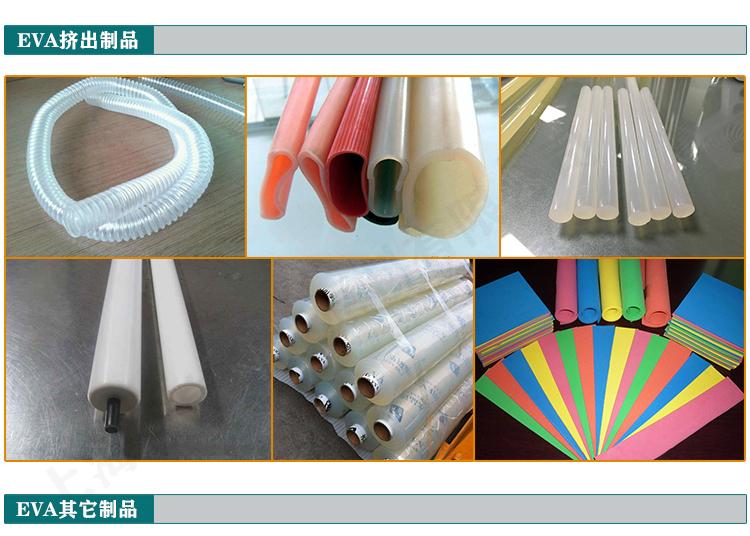 EVA用于薄膜,可以提高薄膜的抗穿刺性能,做PP和PE塑料的增韌劑,發泡鞋材,鞋底,管子,汽車油管,型材,包裝膜,熱熔膠,玩具,色母載體,低煙無鹵電線電纜,改性用,兒童玩具,瑜伽墊,塑料地板,汽車配件,發泡產品,拼豆豆,涼鞋,洞洞鞋,,涂料,膠水。
