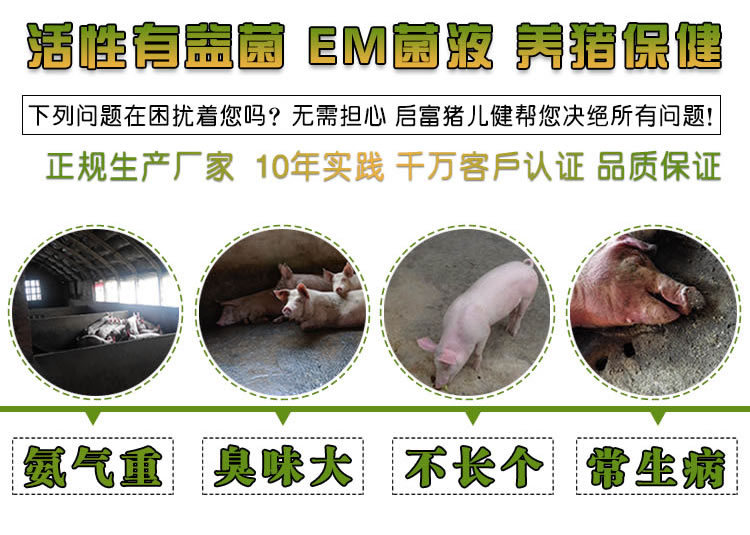 鄭州豫啟富公司推出的豬兒健產品,是養豬EM菌液專用產品,一代原液,使用方便,老廠家,更有實力!公司從事銷售益生菌產品十年,對應全國客戶,使用效果好!