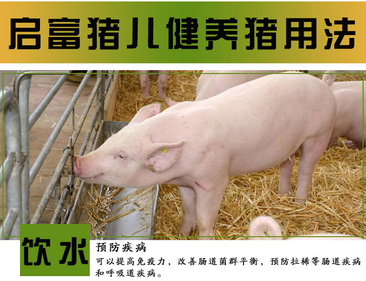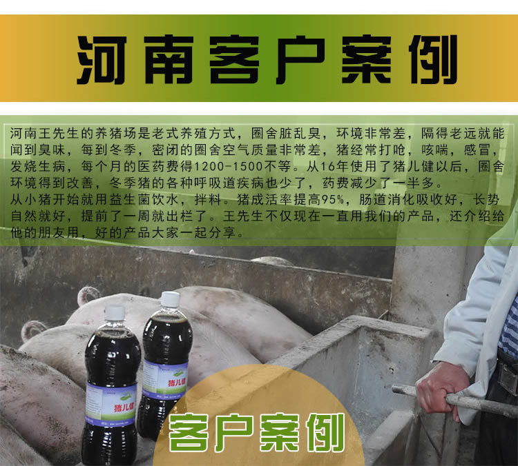 功效:清理腸道有害菌群,增加豬腸道中的有益菌群數量,使豬腸道始終保持良好的生態環境,從而抑制有害病菌的滋生,提高豬的免疫力和抗病性,降低豬各種腸道疾病的發病率。有實驗表明:用豬兒健(養豬專用EM菌液)給豬飲水,可以使小僵豬改善生長性能,逐步恢復到正常的生長速度。