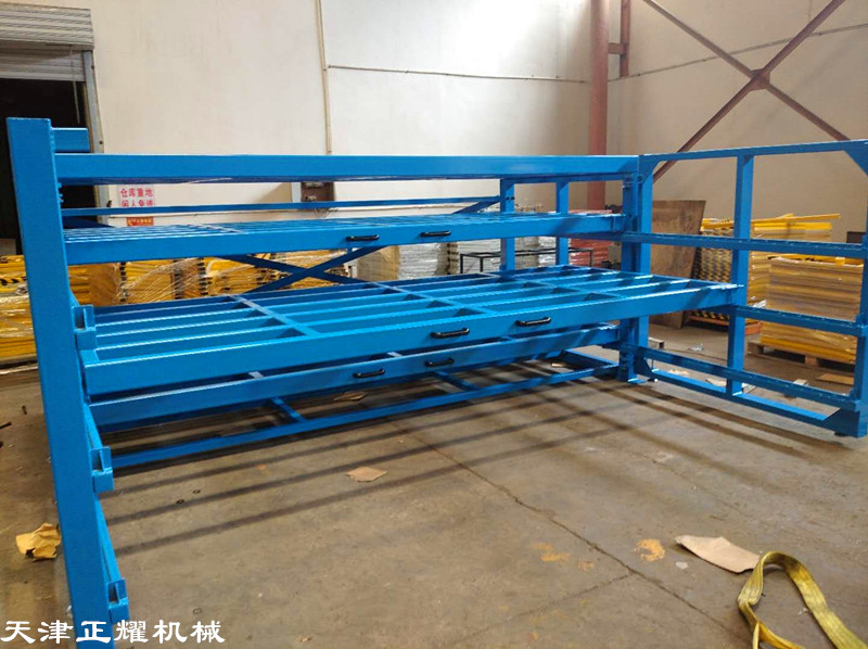 臥式板材貨架采用抽屜式結(jié)構(gòu),一組貨架由4-8個拉出式抽屜組成,每個抽屜承重3噸,存放6米內(nèi)的各種板材。板材分類擺放到抽屜里,隨時使用隨時拉出,單人操作使用。使用行車吸盤吊裝到激光切割機上完成切割工作,節(jié)省時間,存取方便,占地小了,擺放的板材種類多,每種規(guī)格數(shù)量清晰,隨時了解庫存量,及時補充不足的規(guī)格。