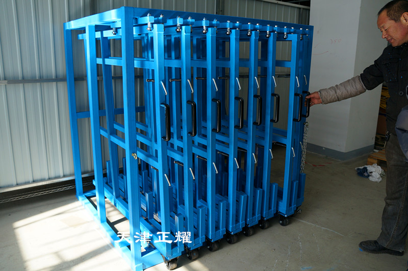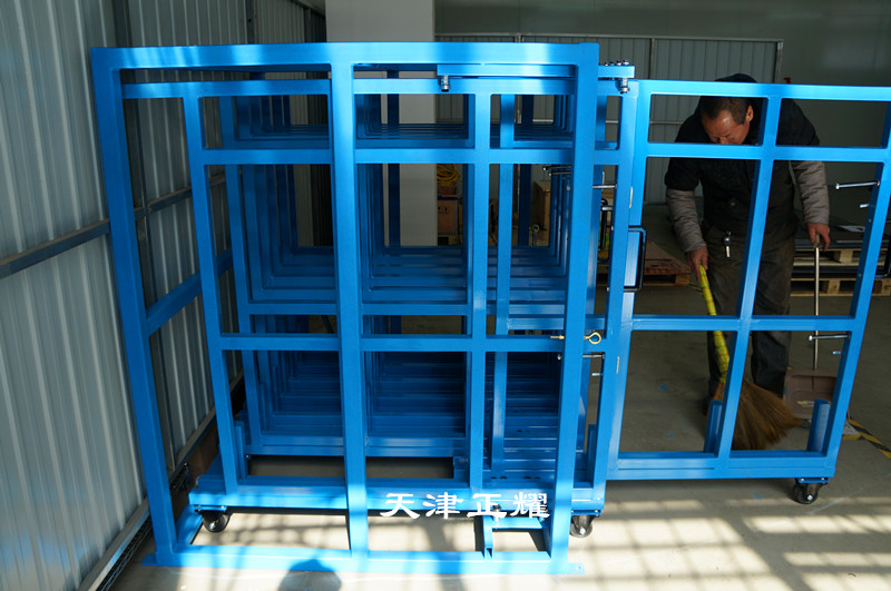 鋁板豎放架焊接式結構,一個大框架里面有多個拉出式小抽屜,每個抽屜可以存放一種板材,承重在500公斤,抽屜數量不限,可以自行選擇。每種板材分開存放不變形劃傷卷邊,存取也方便,單人單手拉出抽屜直接存取不需要借助其他的搬運工具,抽屜底部有移動式腳輪,存取方便作用力小,省時省力省人工。