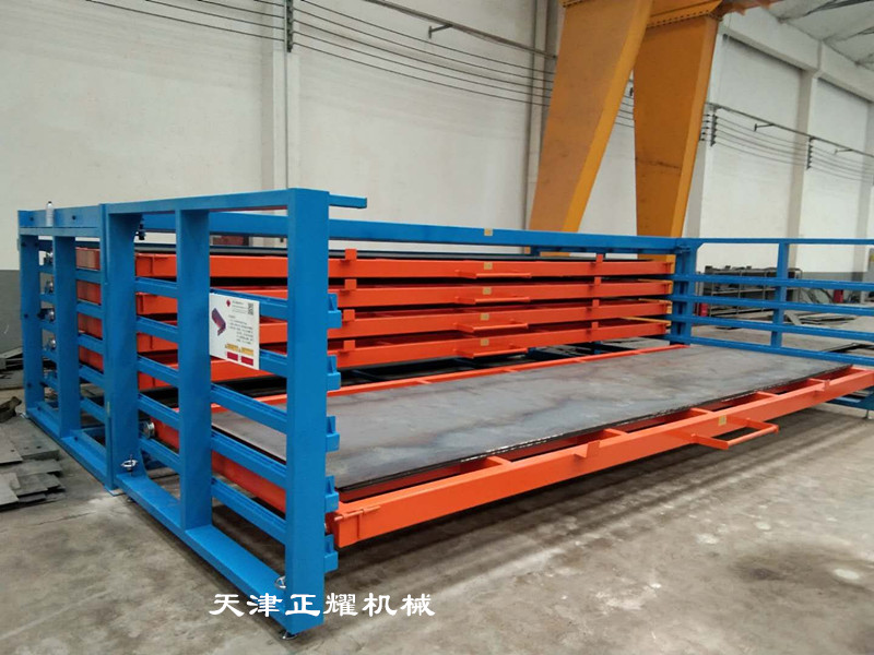 板材貨架采用手搖式抽屜結構,每層抽屜單人單手搖出使用,一個貨位承重5噸,由6層抽屜存放6種鋼板,每種數量清晰,存取使用一個人完成,可以配合激光切割機使用,吊車吸盤吊裝到切割機上快速完成切割下料工作,節省時間人工,提高工作效率,降低人工投入。