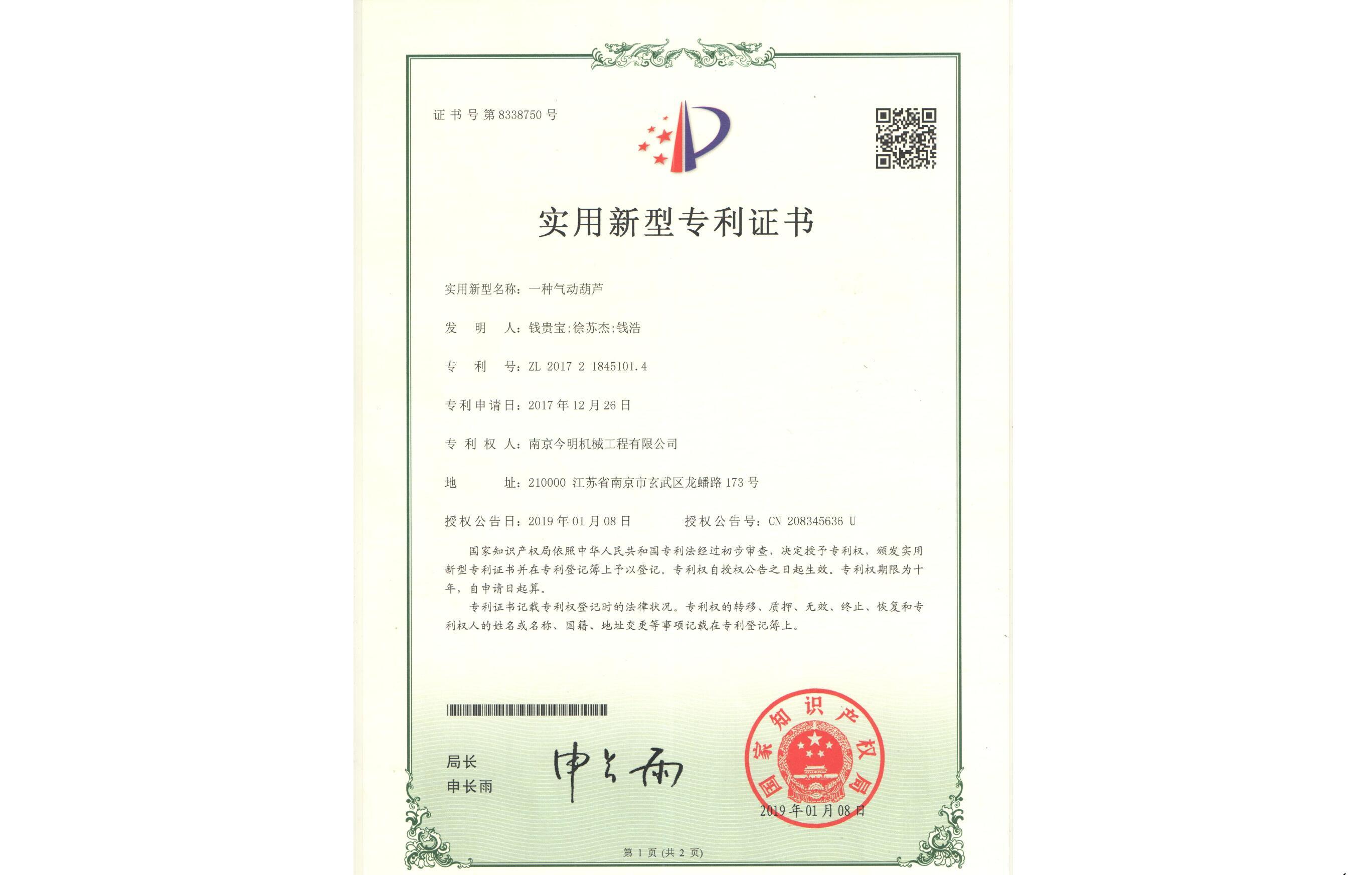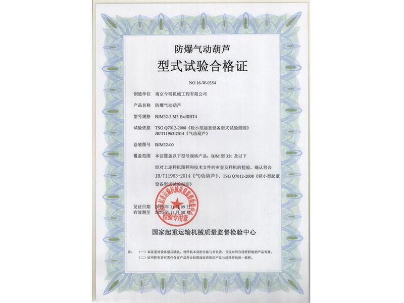 • 防爆氣動葫蘆合格證